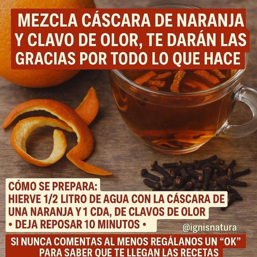 Las cáscaras de naranja están repletas de vitamina C, un nutriente esencial que fortalece nuestro sistema inmunológico. Cuando se combinan con los clavos de olor, conocidos por sus propiedades antibacterianas y antivirales, esta mezcla se convierte en un escudo natural contra resfriados y gripe.